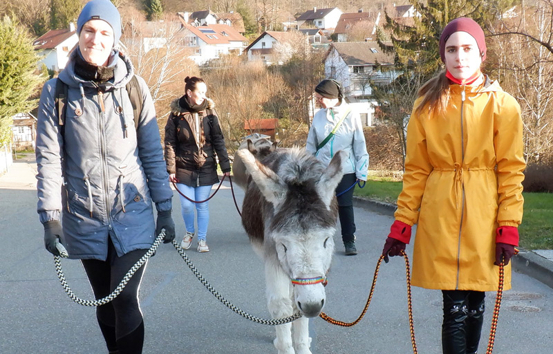 „Zeit statt Zeug“ – ein schönes Motto :) Heute mache ich mit Mama, Anna und Oma Jutta einen Ausflug nach Gaggenau, das ist am Rande des Schwarzwaldes. Dort besuchen wir die Esel Baldur und Karim, mit denen machen wir eine Wanderung. Supi war’s :)
